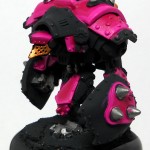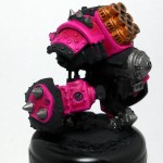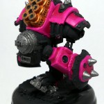 Next, all the metal areas get a coat of GW Boltgun Metal. Then, the Smokestacks get some bronze, as does the face. Lastly, I go over all the pink areas with two coats of P3 Murderous Magenta.  Since this is a dark color over a light color, I have to be super careful about brush strokes.  So, I make sure that on the first coat, I keep all my brush strokes going in the same direction.  This will make it easier to go perpendicular to them next time.  By brushing in a perpendicular direction, there’s no chance for paint to build up in lines, and no chance for thin spots so you’ll maintain a nice, smooth surface.