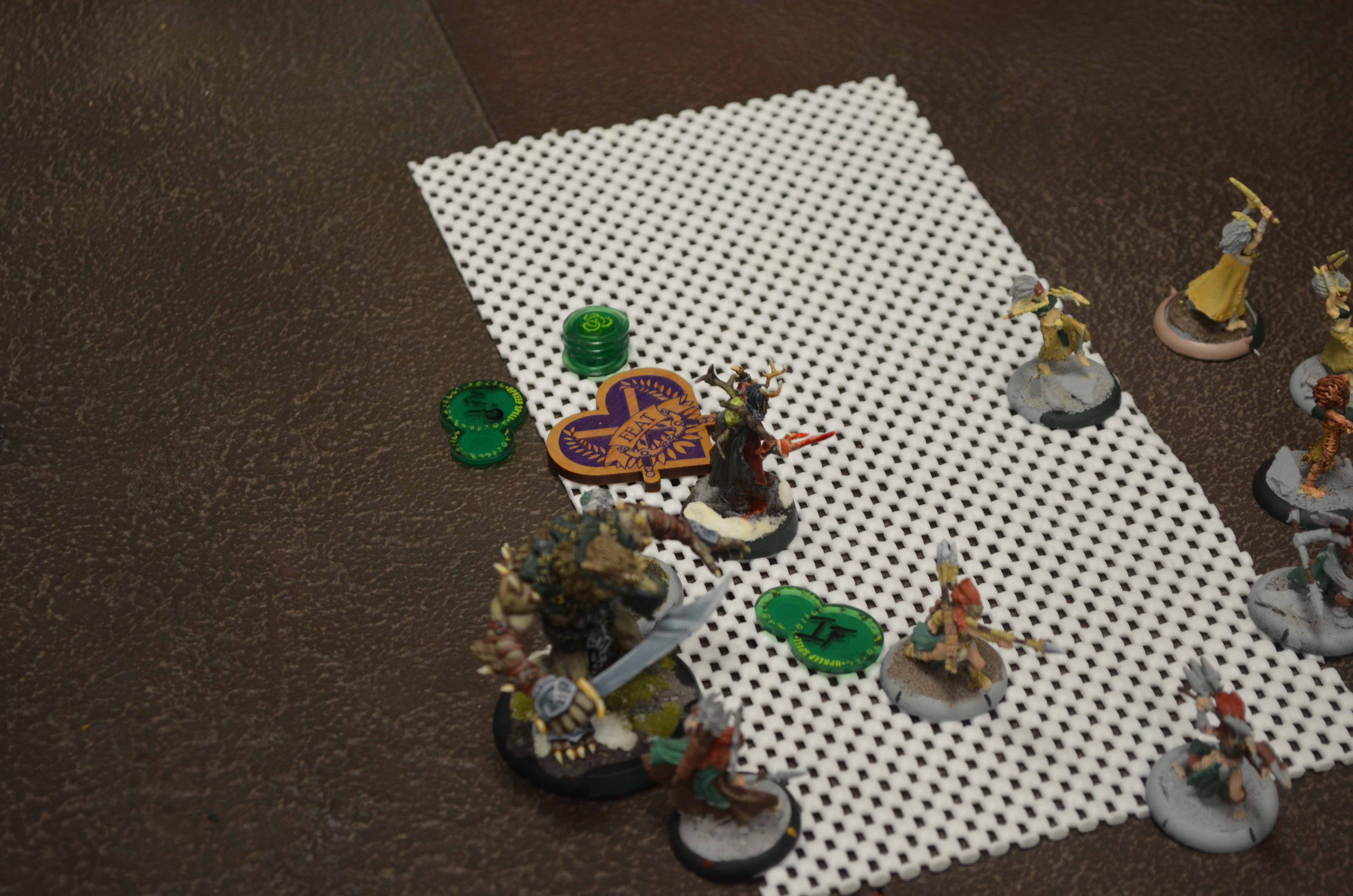 One of our fancy Feat tokens in use, thanks to the folks over at Muse on Minis. The warcaster there is a the Skarre1 chassis in Circle Orboros.