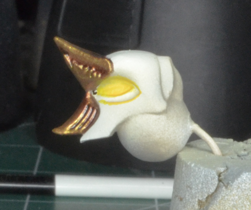 Next, I start adding on a darker tone. For this, I used P3 Heartfire. It’s hard to detect in the pictures, but I covered the rear 2/3 of the eye. This color needed three coats to finally show up over the yellow. This is partly due to the transparent nature of the thin paint, and partly because the two colors are very close.